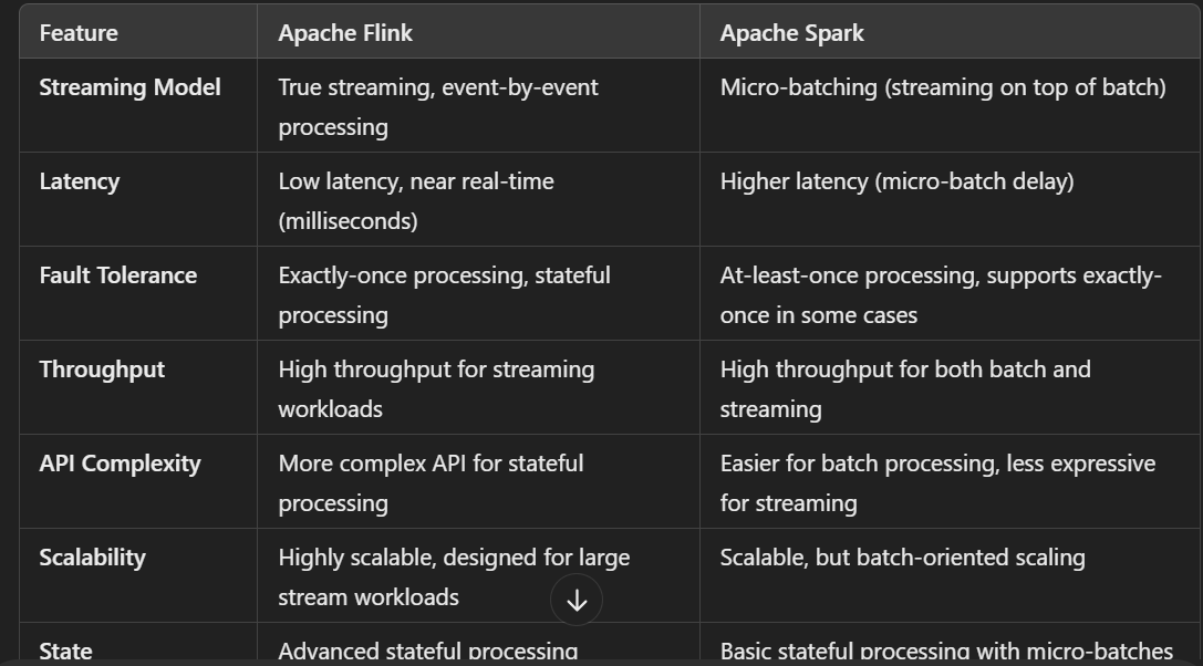 Higher Latency: Because Spark processes data in micro-batches, it typically has higher latency (depending on batch size, can range from a few seconds to minutes).