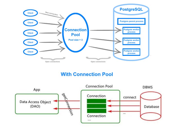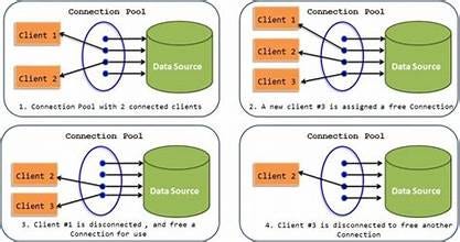Request Handling: When a client request needs to interact with the database, it borrows a connection from the pool.