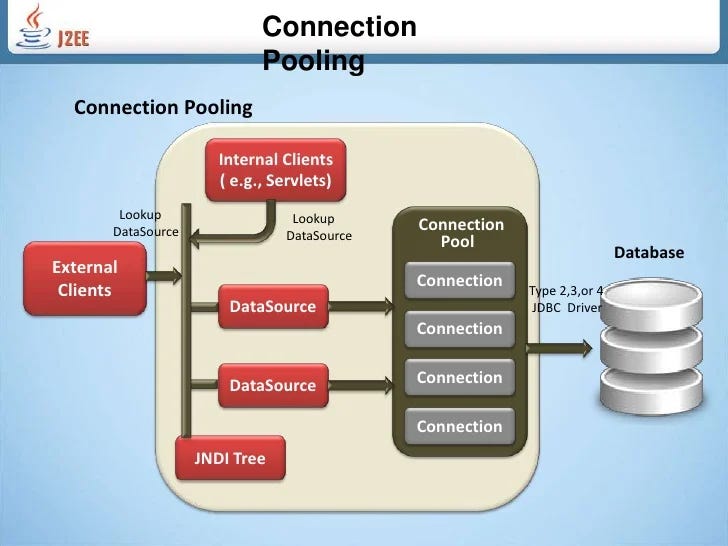 Initialization: At application startup, a pool of database connections is created and maintained.