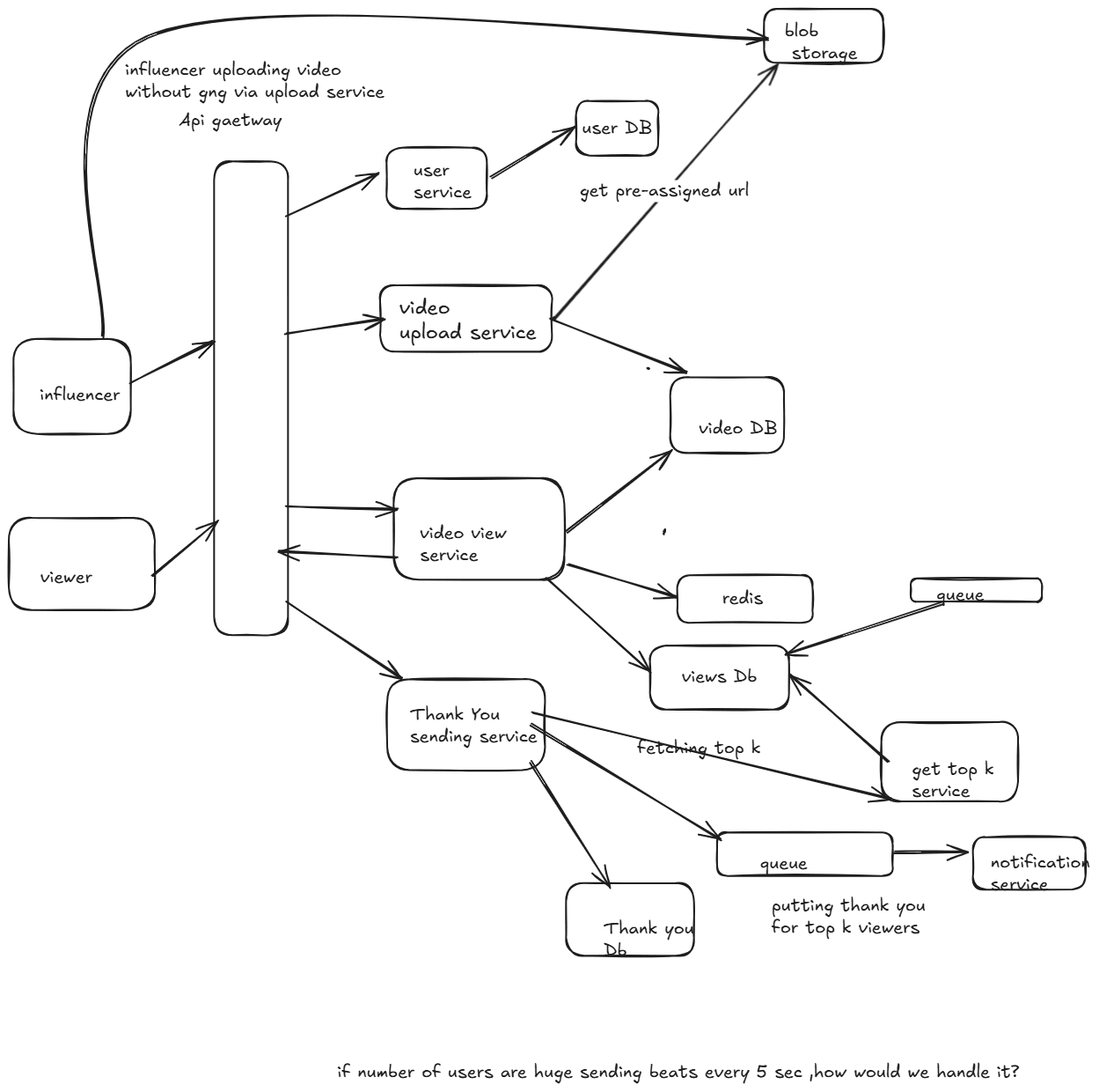 Design a system where Influencers upload videos and send Welcome note to top K Users