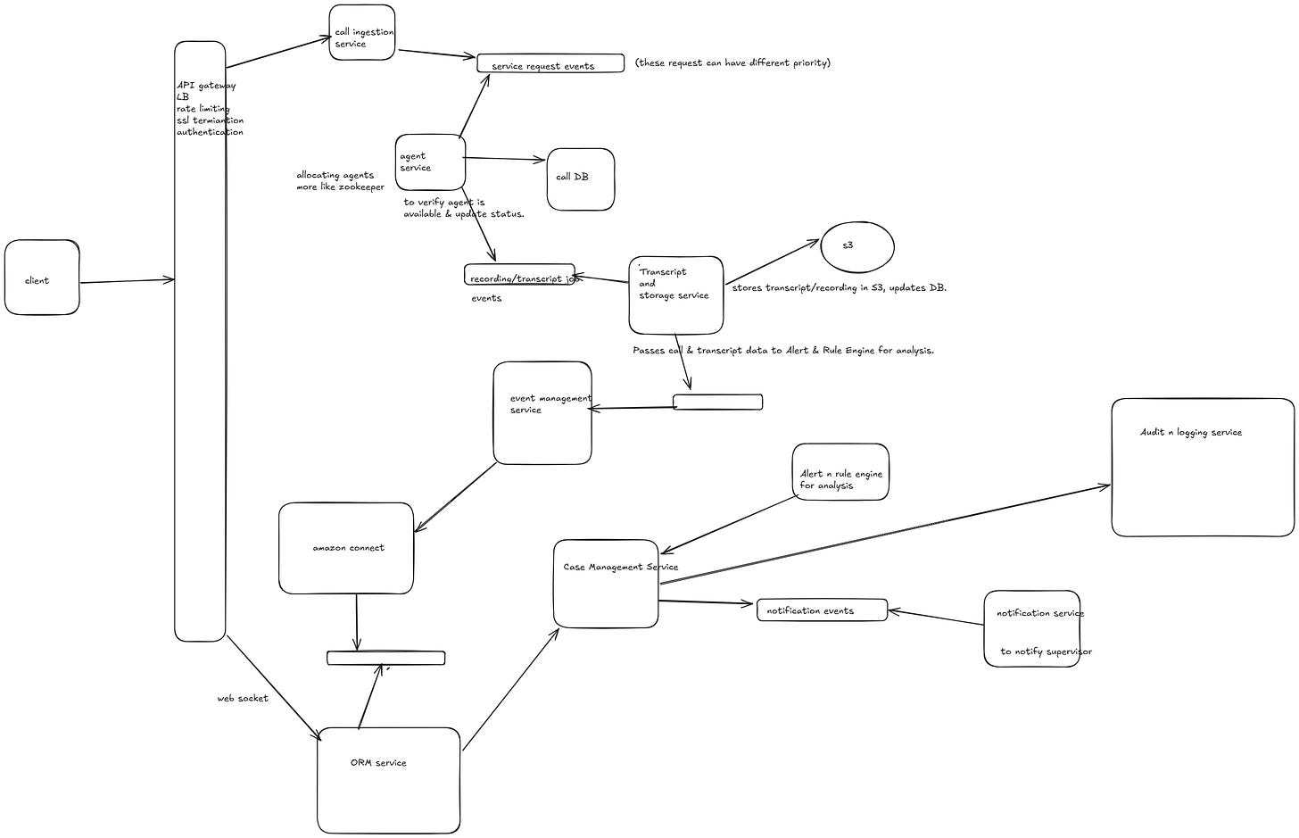 ⬅️ Transcription & Storage Service stores transcript/recording in S3, updates DB.