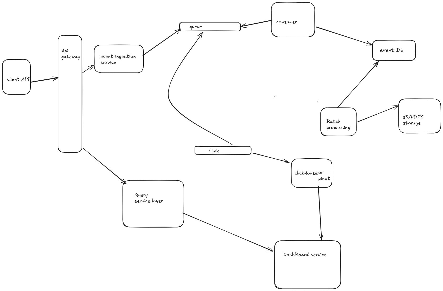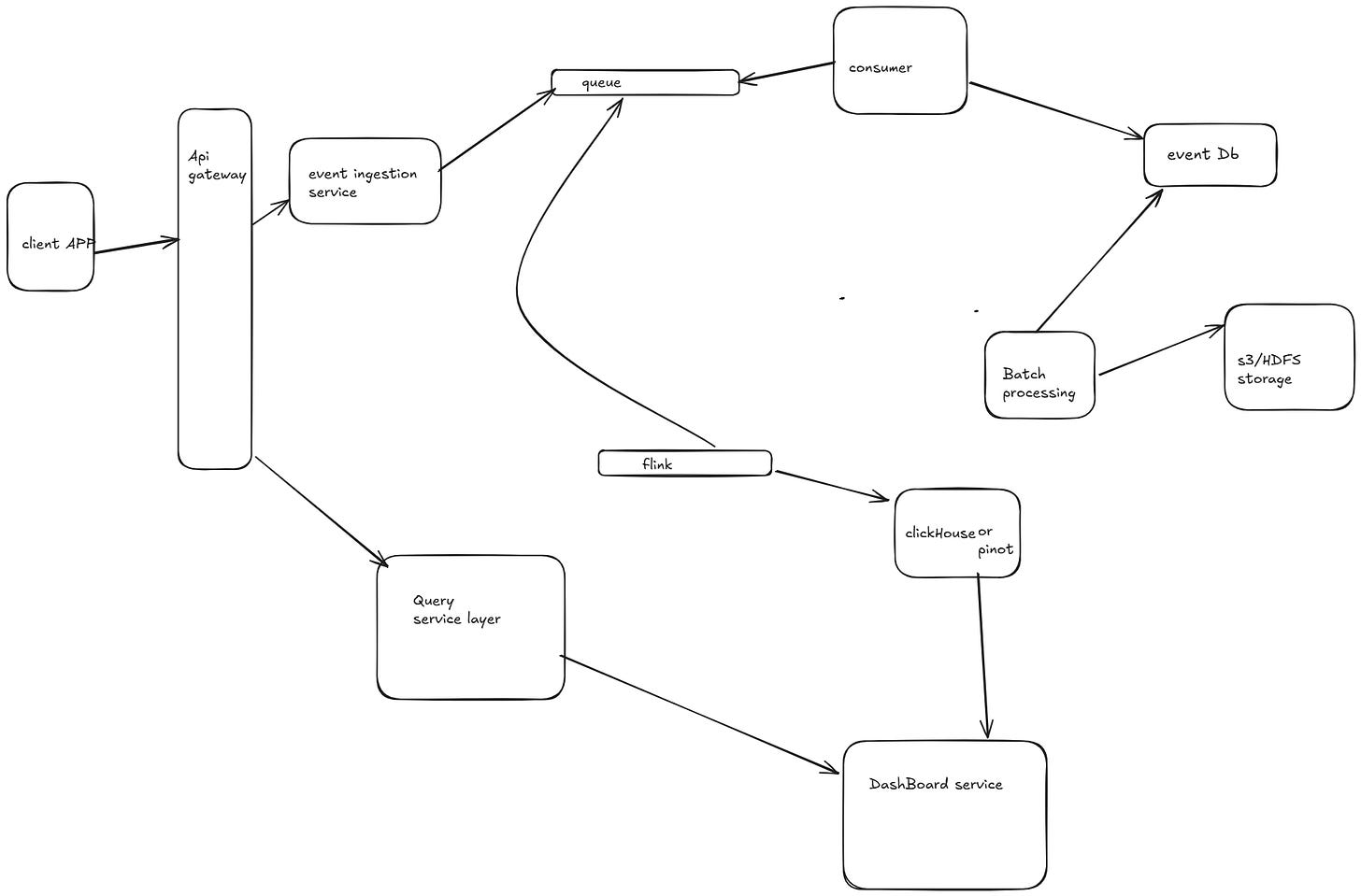 Event Ingestion → Kafka → Processing (Flink/Spark) → Storage (Druid/S3) → Querying (ClickHouse/Druid) → Dashboards.