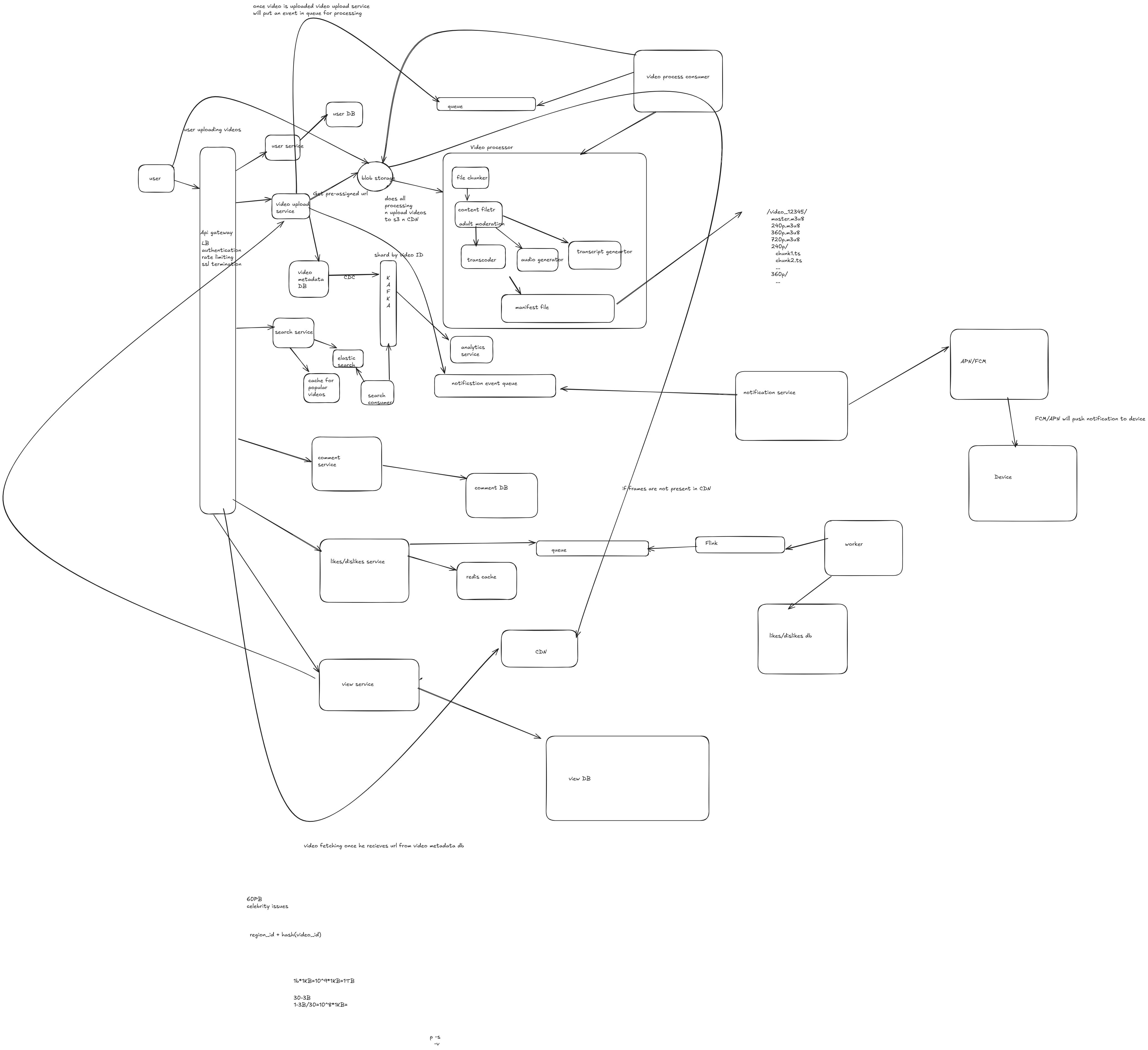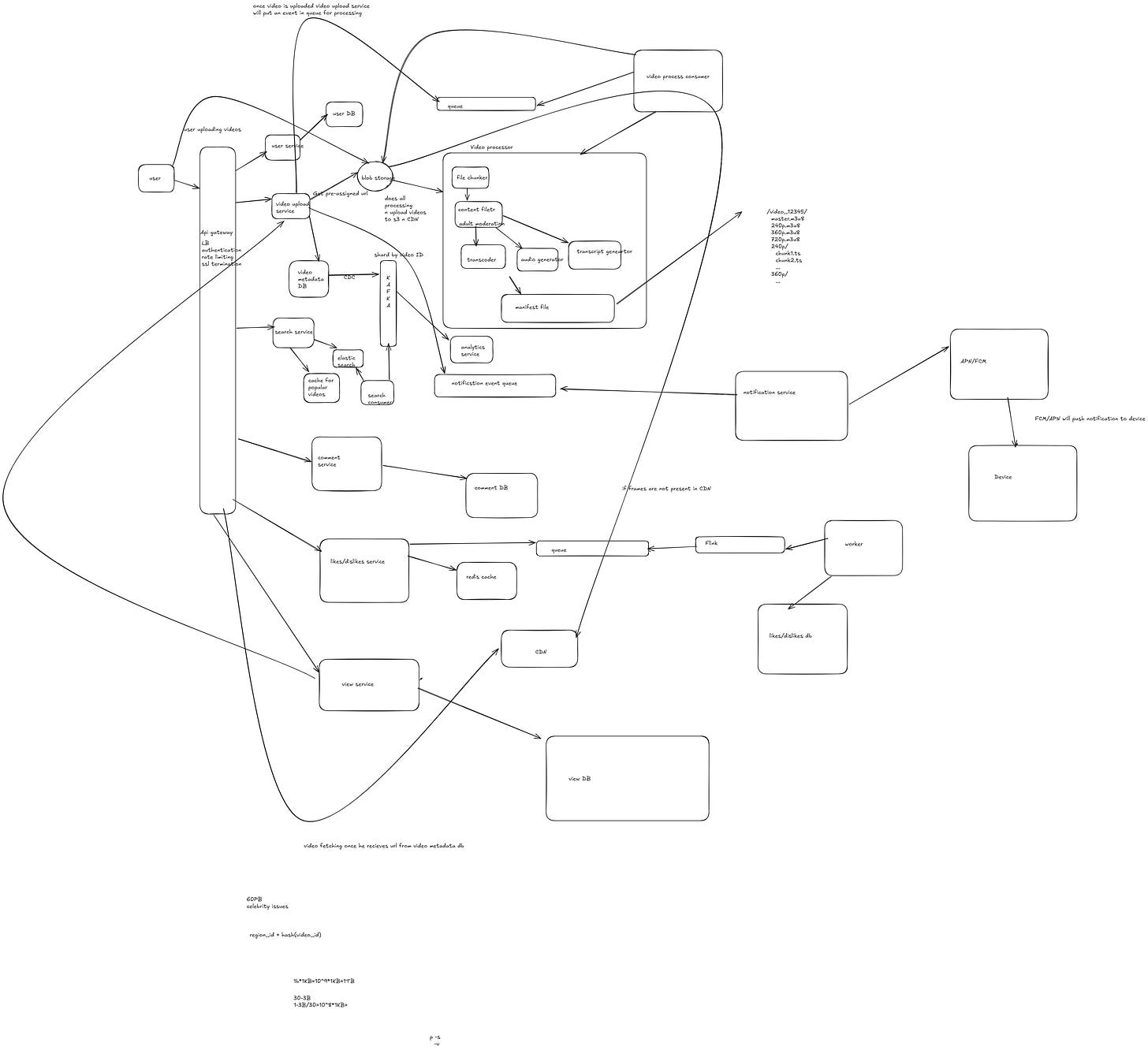 CREATE TABLE videos ( video_id VARCHAR(50) PRIMARY KEY, title TEXT NOT NULL, description TEXT, user_id VARCHAR(50), upload_time TIMESTAMP, visibility ENUM('public', 'private', 'unlisted'), tags JSONB, status ENUM('processing', 'completed', 'failed'), views BIGINT DEFAULT 0, likes BIGINT DEFAULT 0, duration INT, -- in seconds thumbnail_url TEXT );Users Table