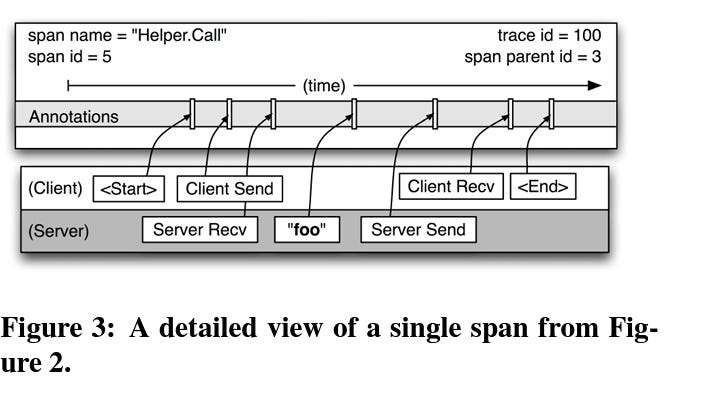 Trace Spans: Dapper represents a request's journey as a series of spans, each corresponding to a unit of work in a service.