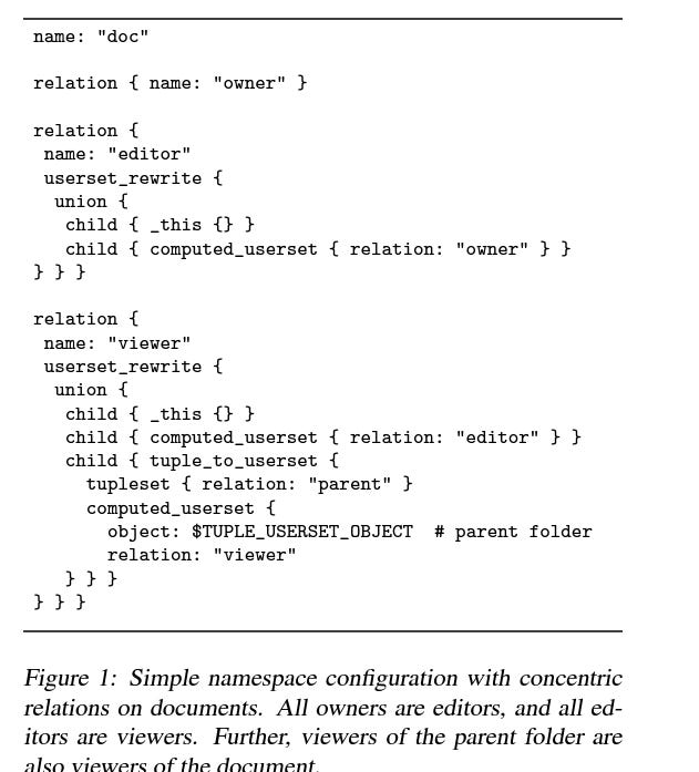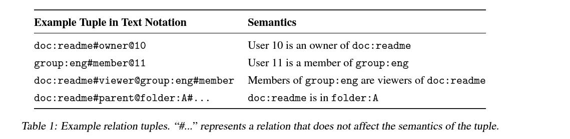 Zanzibar represents access control relationships in a tuple-based data model, where each tuple is structured as: