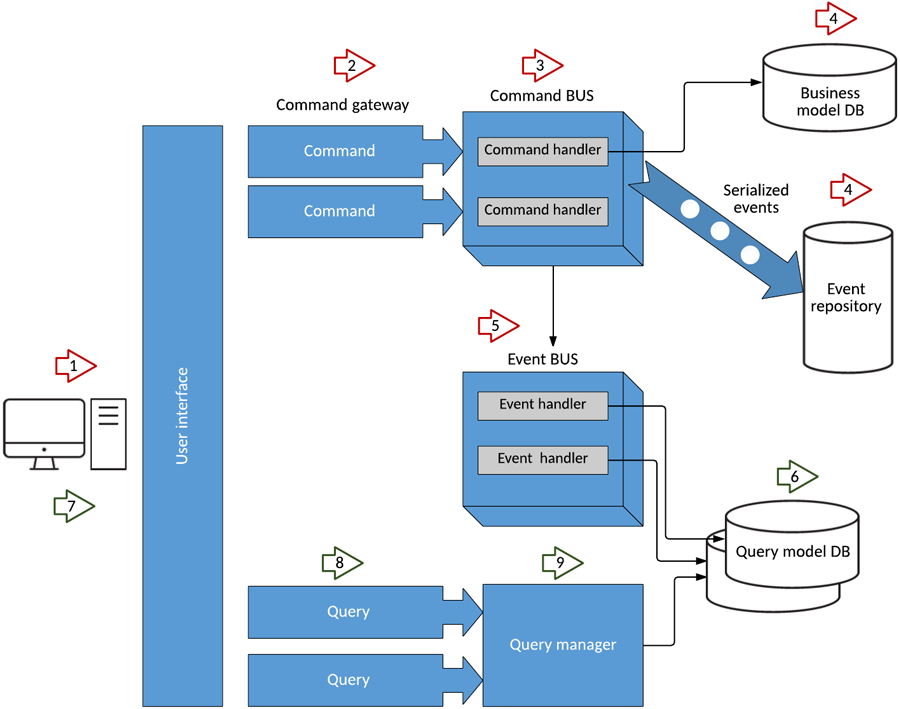 Commands can trigger events, which are propagated to update the read model asynchronously.