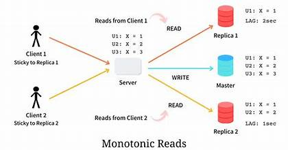 t2, the client reads data from replicaBand gets the older valuex = 5(due to replication delay).The client observes non-monotonic behavior, which can lead to inconsistencies in the application logic.