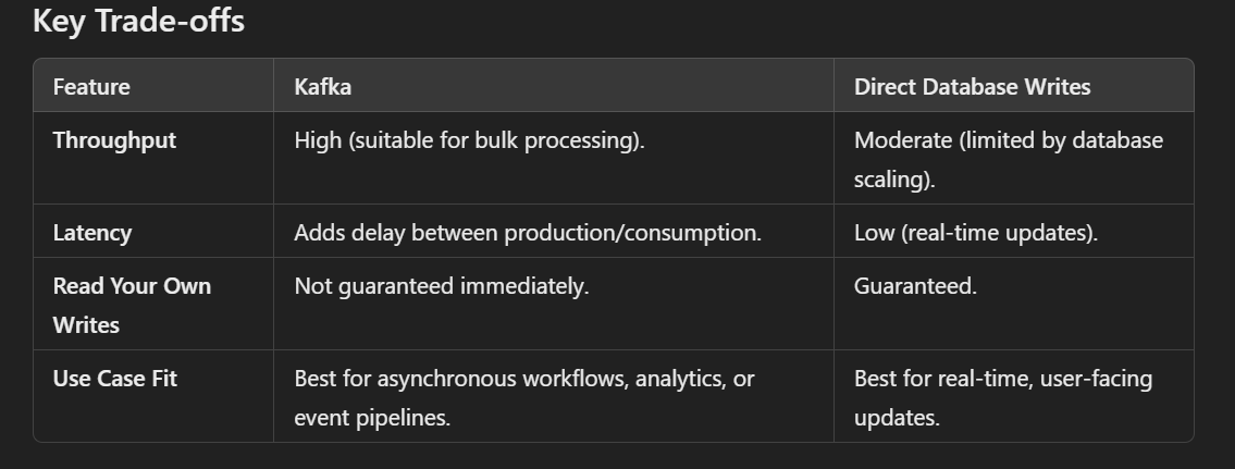 When designing systems, it’s important to align tools with the requirements of the use case. For scenarios requiring immediate feedback and "read your own writes" consistency, direct database writes are a better fit than Kafka. Kafka's inherent delays can lead to user frustration and inconsistencies, making it unsuitable for critical user-facing workflows like adding items to a cart, order placement, or payment updates. Always evaluate the trade-offs and design systems that meet user expectations seamlessly.